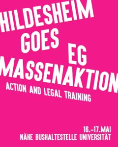 Zur Vorbereitung der EG-Massenaktionen vom 28. bis 30. Mai 2026 findet am 16. und 17. Mai in Hildesheim ein Aktions- und Rechtsworkshop statt. Alle sind herzlich willkommen, auch wenn ihr schon einmal an einem solchen Workshop teilgenommen habt.